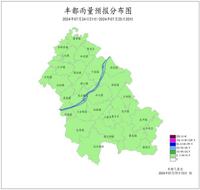 2024年7月12日16时至7月19日16时我县阵雨转晴天。最大周累计降雨量为72.9mm(社坛)。最低气温17.4~25.4℃,最高气温23.9~40.9℃。双路、社坛、三建、丰都站、南天湖景区、峰子山、三抚出现7-9级大风,极大风速23.1米/秒(武平峰子山,17日07时)。丰都国家基本站周累计降雨量20.8mm,最低气温24.5℃,最高气温37.4℃。