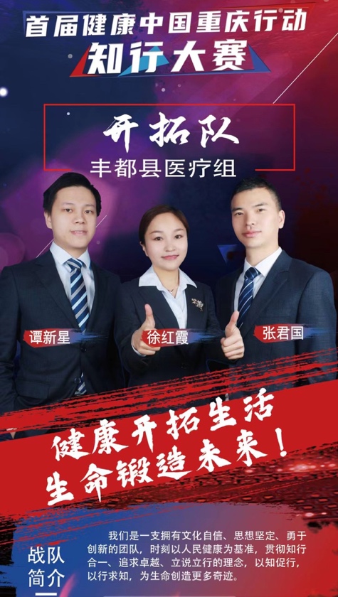 11月2日至4日,由健康中国重庆行动推进委员会办公室、中共重庆市委宣传部、重庆市教育委员会、重庆市人力资源和社会保障局、重庆市卫生健康委员会、重庆市体育局、重庆市总工会、共青团重庆市委员会、重庆市妇女联合会、重庆市科学技术协会联合举办的首届健康中国重庆行动知行大赛在重庆澳维酒店、重庆广电大厦分别举行了半决赛和决赛。健康中国重庆行动丰都县推进委员会办公室选派的“视而不见”战队和“开拓”队,分别代表我县非医疗组和医疗组参与奖项角逐。